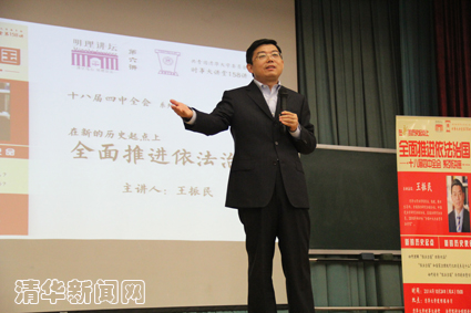 王振民在讲座中首先对十八届四中全会的意义和主要内容进行了解读。他认为,此次全会,是中国共产党建党九十多年以来第一次在中央全会上专题讨论法治问题,表明法治建设已经上升为与经济建设、文化建设、党的建设等问题同等重要的一项顶级战略命题。他将本次全会内容概括为“系统完整,具体到位,坚决果断”十二个字。具体而言,“系统完整”指的是会议涵盖立法、执法、司法、守法等各方面,对依法治国各个环节都作出了系统规划;“具体到位”则是指此次四中全会使法律界、法学界长期关注的诸多问题都得到了具体到位的解答,充分体现了高屋建瓴与社会实际的结合;“坚决果断”是指如此大规模地进行法治建设,是人类历史上从来没有的,充分体现了新一代中央领导集体的责任担当和强烈的历史使命感。
