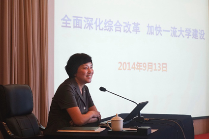 陈旭介绍了学校综合改革的概况,并对学生系统如何积极参与改革提出了指导意见。她指出,学校的综合改革无论在国家发展需求、高等教育发展趋势和学校自身发展目标上看,都是一场“使命驱动”的改革。要以开放带动改革,以改革促进发展,建立以学术为导向的开放竞争的发展机制,建立完善中国特色的现代大学制度和治理体系,探索高等教育大众化阶段创建一流大学的发展模式。陈旭要求努力构建价值塑造、能力培养、知识传授“三位一体”的学生工作体系,并从学校人才培养的需要、学校综合改革的系统性、学生工作自身发展三个层面强调了这项工作的紧迫性和重要性。对下一阶段的工作,她希望学生系统要明确目标,制定好改革方案,贯彻“三位一体”的目标;要带好队伍,加强工作指导和思想交流,提升队伍的工作能力、水平和作风,学生工作系统的老师和同学都要努力成为“双肩挑”的榜样;要加强研究,先行先试,为全国高校学生工作的改革发挥示范作用。