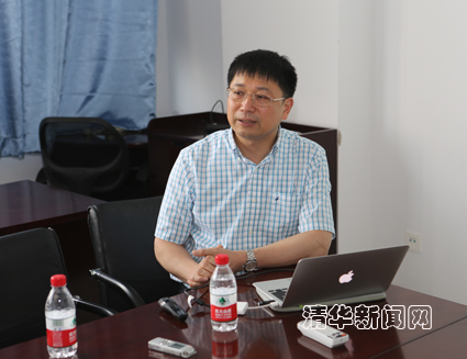 图为陈旭与化学系教师交流。记者 智 斐 摄