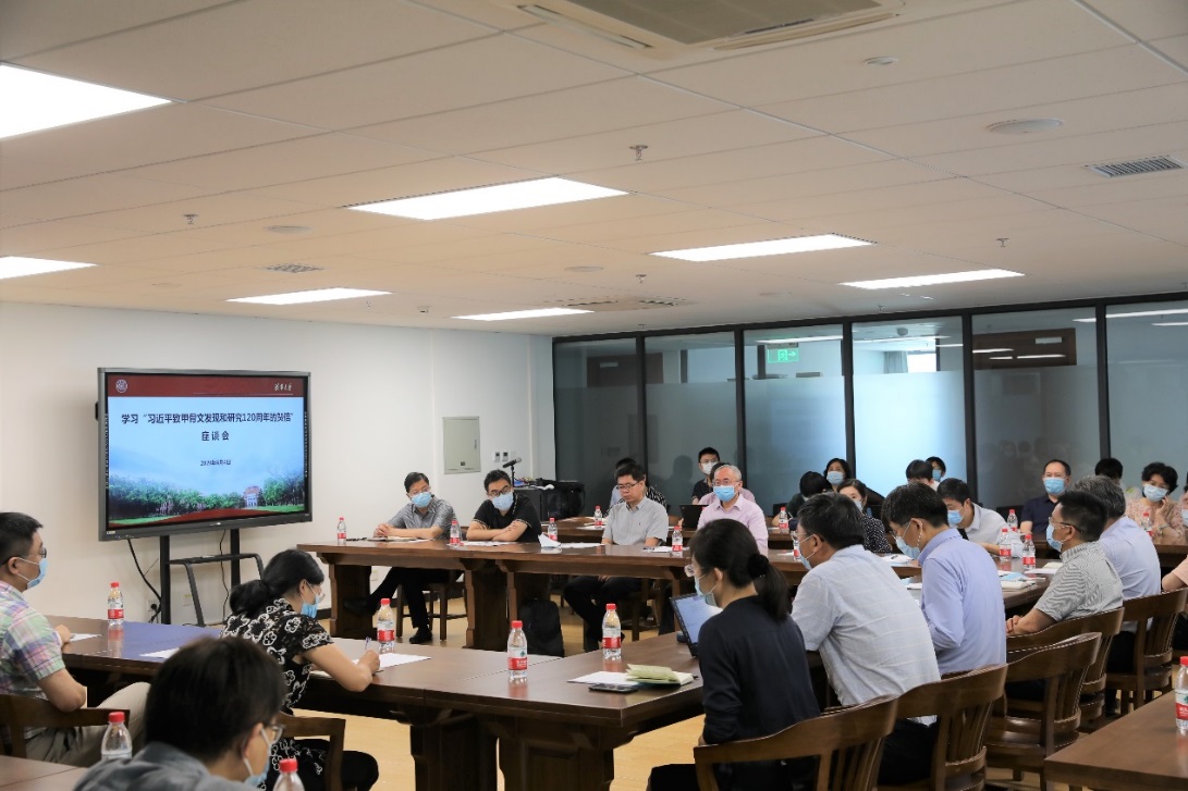出土文献中心教师代表、教务处党支部全体成员、文科建设处工作人员共计50余人参加座谈会。会前,出土文献中心组织参会人员参观了新葡萄简。