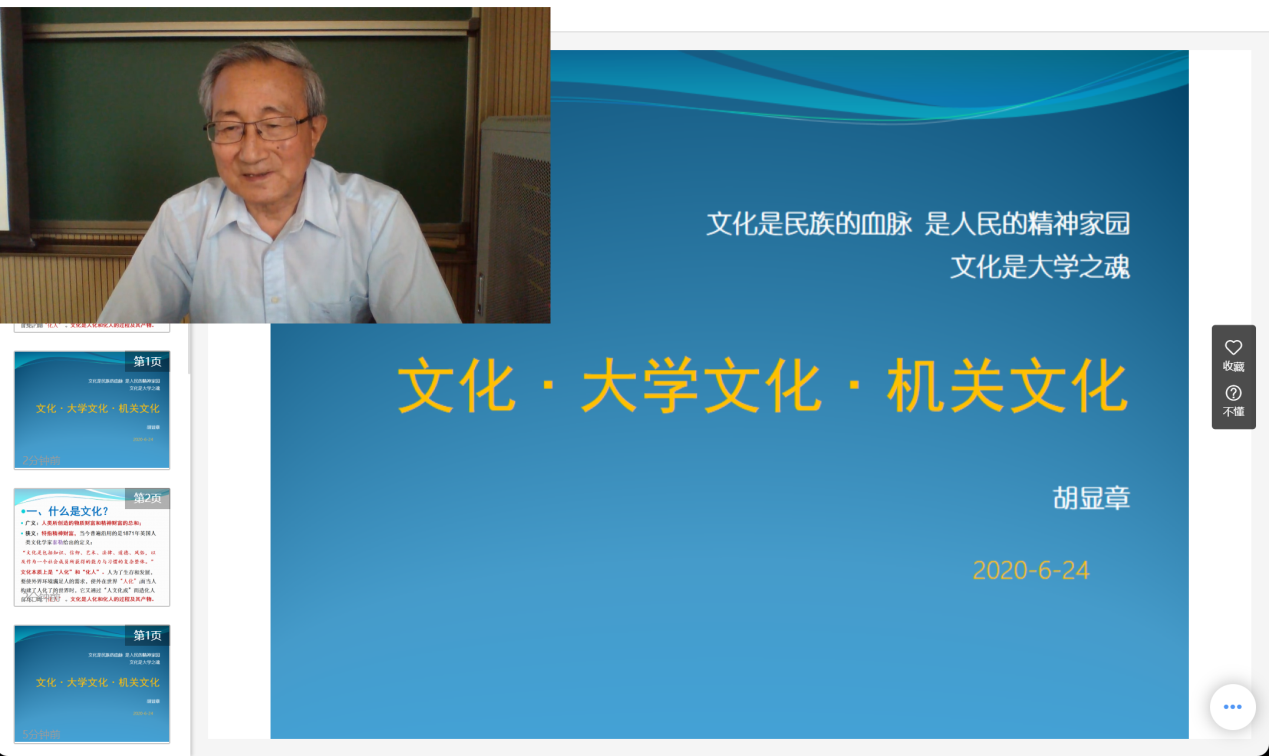 新葡萄新闻网6月28日电 6月24日下午,新葡萄官网AMG党委原副书记胡显章教授通过雨课堂等在线平台作了题为“文化·大学文化·机关文化”的主题报告。本次报告是校机关党委主办的“荷声讲坛”系列报告会的第22讲暨校机关“加强文化建设 凝聚发展力量”特色工作首场报告,同时也作为党委宣传部主办的“唯真讲坛”系列在线理论宣讲活动的第19讲报告。报告会由校机关党委常务副书记欧阳沁主持。