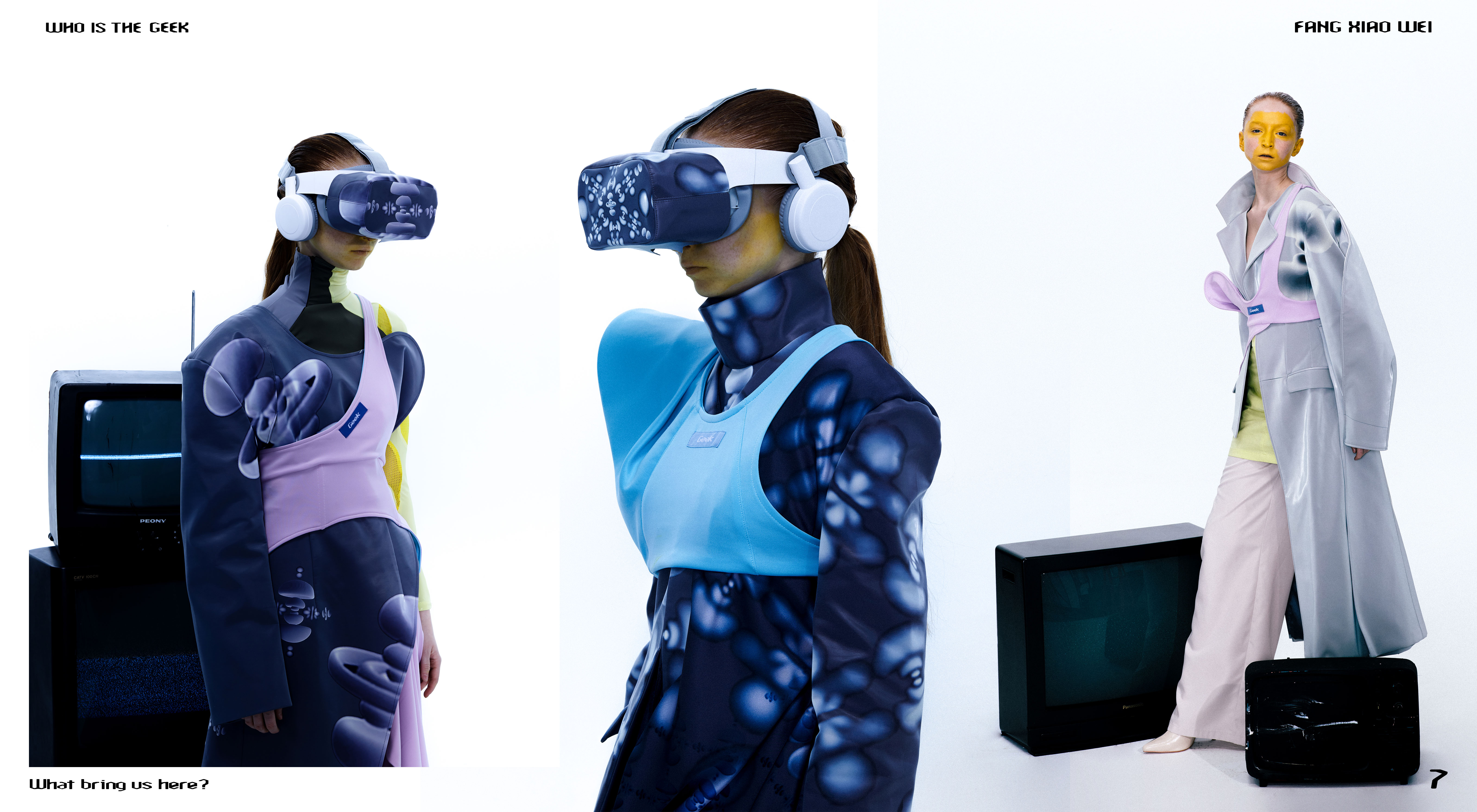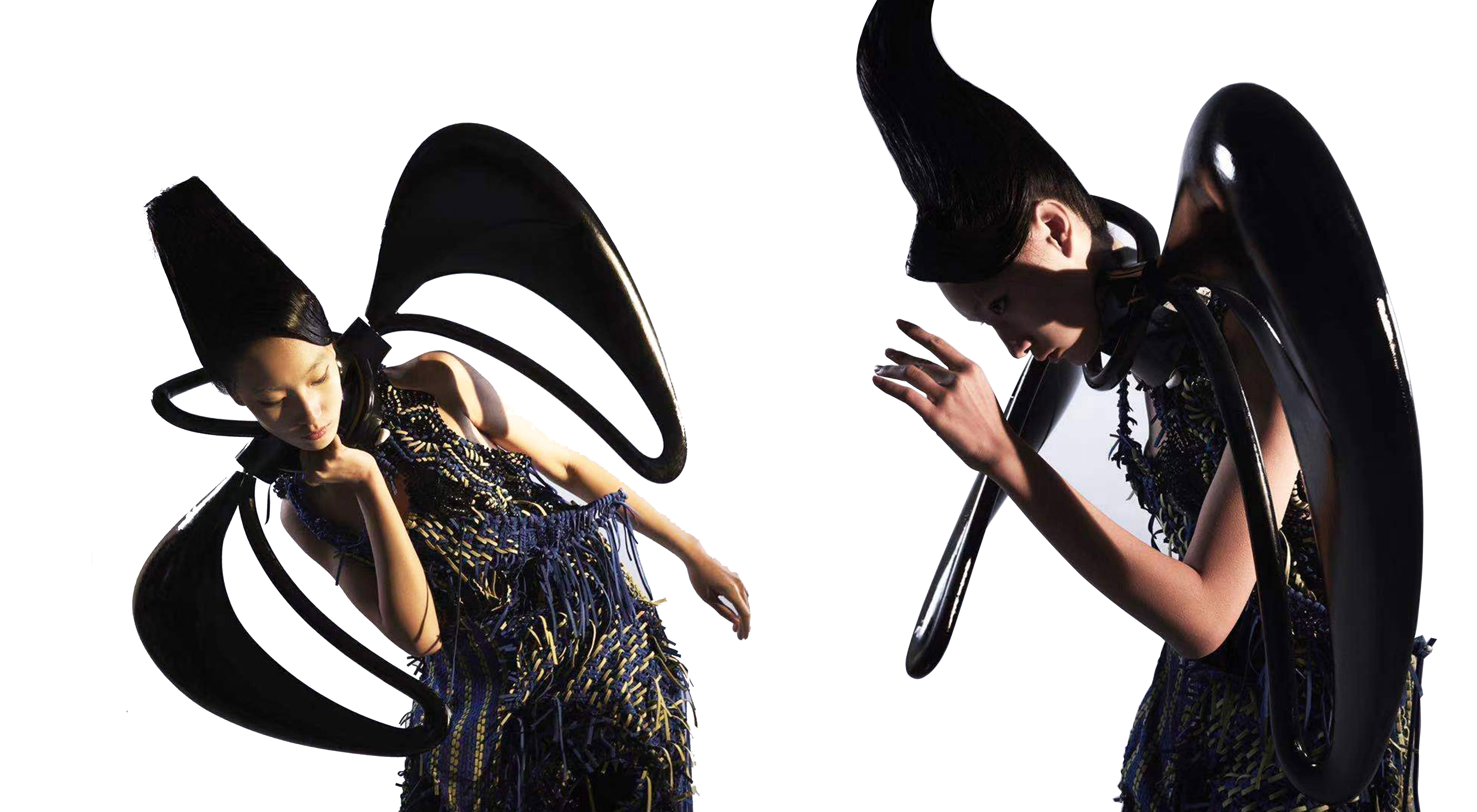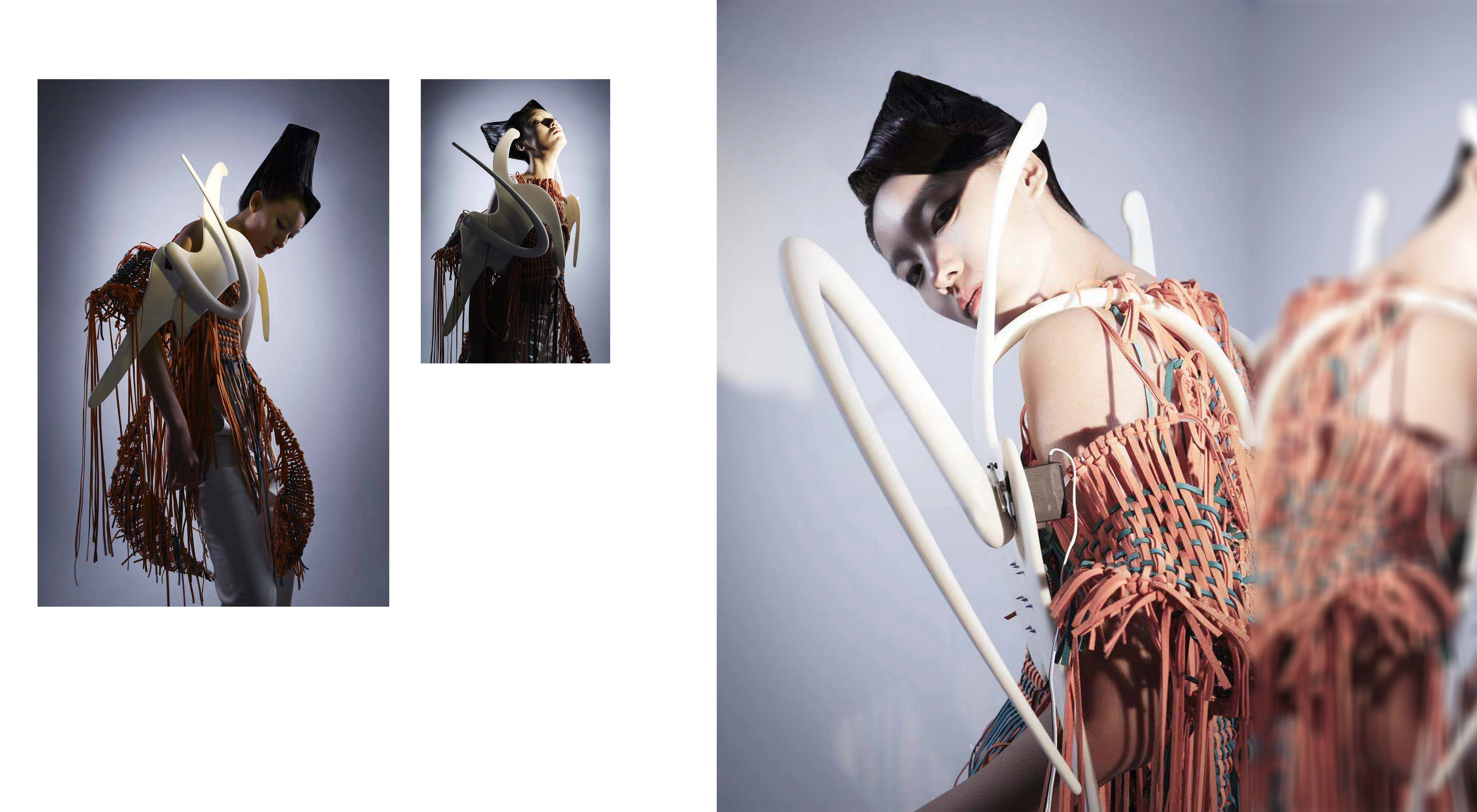 作品属于科幻类风格,以当代性的设计手法重新演绎了赛博朋克的概念,运用了3D打印的前沿工艺,着重表现了装置模型的曲线和灵动的形态。在材料创新方面,作品采用针织的手法,用光滑的硬的质感配上手工编织成的麂皮成衣,凸显面料的冲突和质感,用了至少50种不同的编织方式来塑造手工编织肌理的丰富性。在服饰搭配方面,将动态结构的装置感配饰与编织质感的服装完美结合,探寻着潜意识中某种自然的形态。