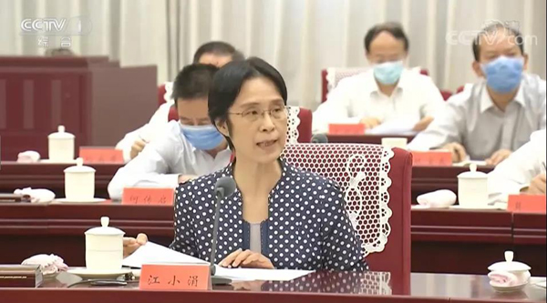 24日下午,江小涓在经济社会领域专家座谈会上发言