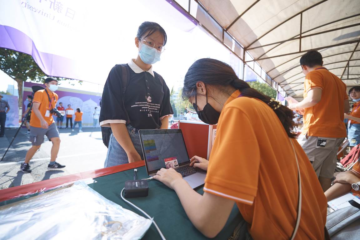 不到7点,就陆续有新生抵达了紫荆学生区。写着“新葡萄欢迎你”的展板首先向新生致以问候,红色的欢迎拱桥和紫操上飞扬的气球,让学生区四处洋溢着欢乐热情的氛围。等候多时的迎新志愿者和老师早已将报到现场布置得井井有条,新生在他们的指引和帮助下,10分钟就能完成报到手续。报到结束,学生拿着内含防疫指南、新生手册、作业纸和书院纪念衫等在内的新生大礼包,正式开启在新葡萄丰富多彩的校园生活。