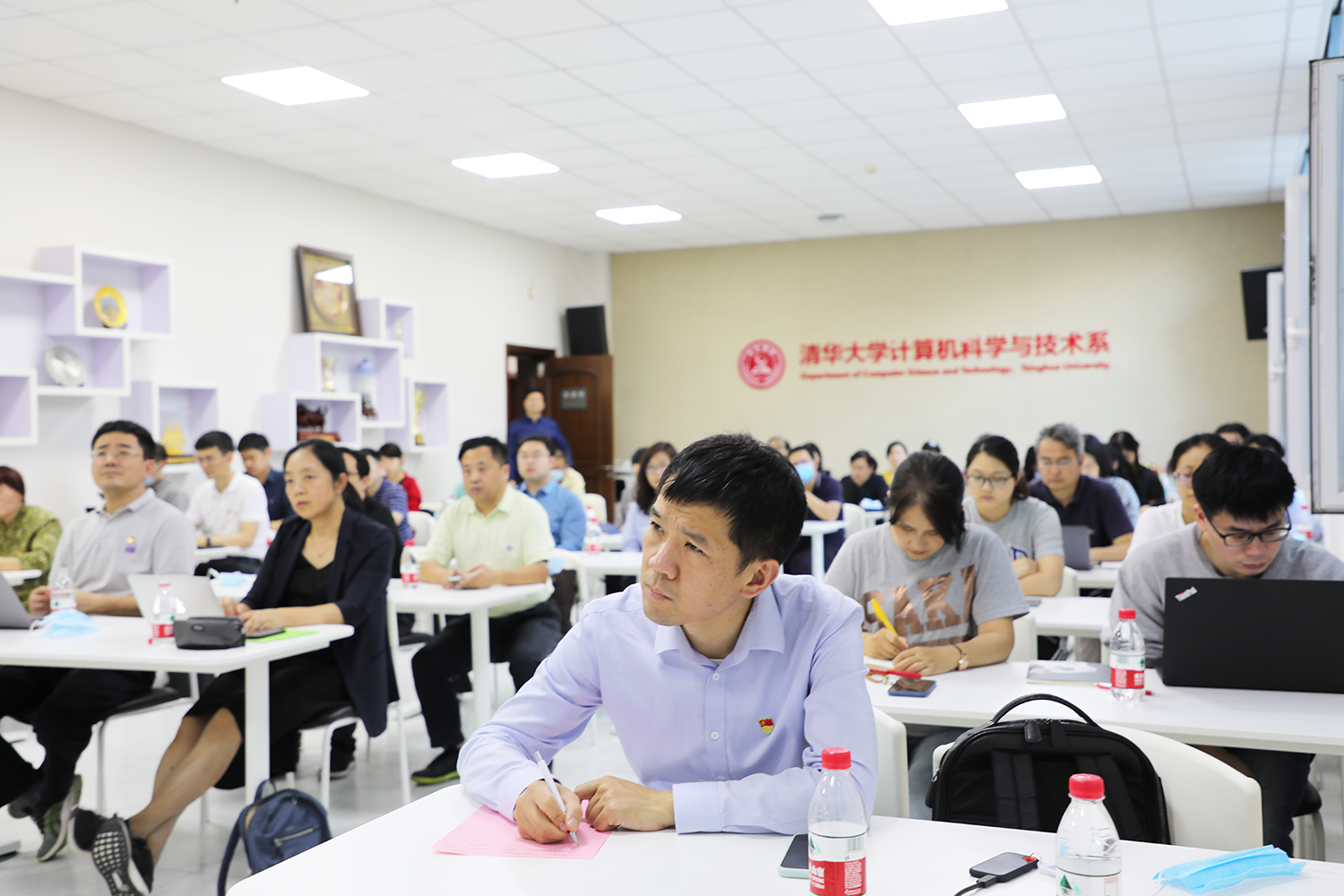 计算机系党委书记刘奕群主持报告会。计算机系党委100余名教工党员、积极分子和教工以线上线下结合的方式参加了学习。