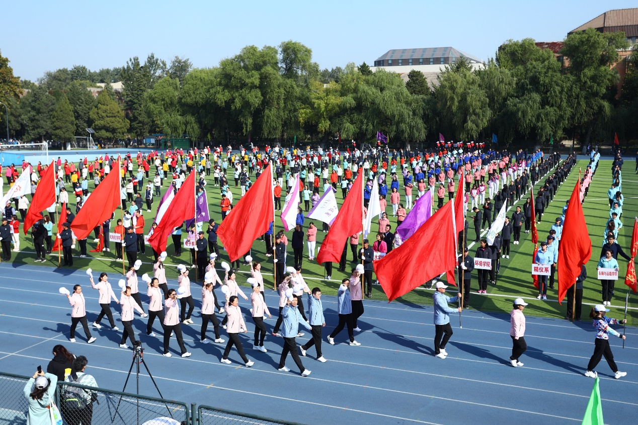 一面面红旗迎风招展,国旗班,红旗队,院系、部处和直附属单位等59个分工会的教职工依次步入操场,他们步伐稳健,精神抖擞,充满自信与活力。1000余名教职工参与了开幕式的广播操表演,以整齐划一、刚劲有力的动作展现了良好的精神面貌,成为蓝天下一道亮丽的风景线。航天航空学院兰旭东、体育部邢玮分别代表运动员、裁判员宣誓。