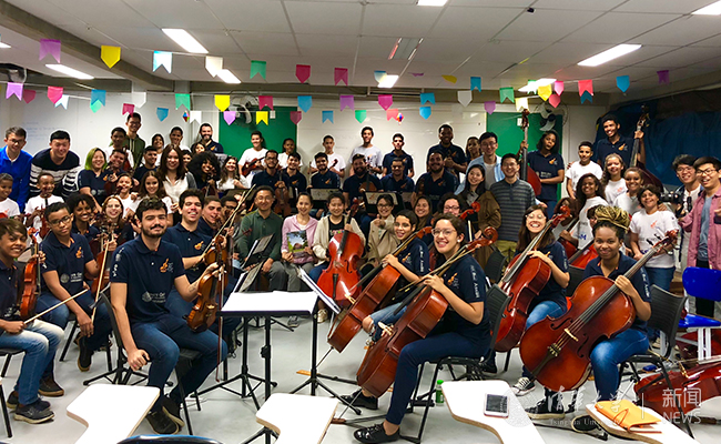 2018年暑期,“丝路新探”赴巴西社会实践支队的14名师生参访了由中国国家电网巴控公司赞助的“马累明日之潮交响乐团”公益项目。以音乐为途径,中国企业为巴西贫民阶层青少年提供了一种远离犯罪、走出贫困的可能,也探索出一条民心相通新路径。交流最后,乐团邀请师生共唱中国经典曲目。