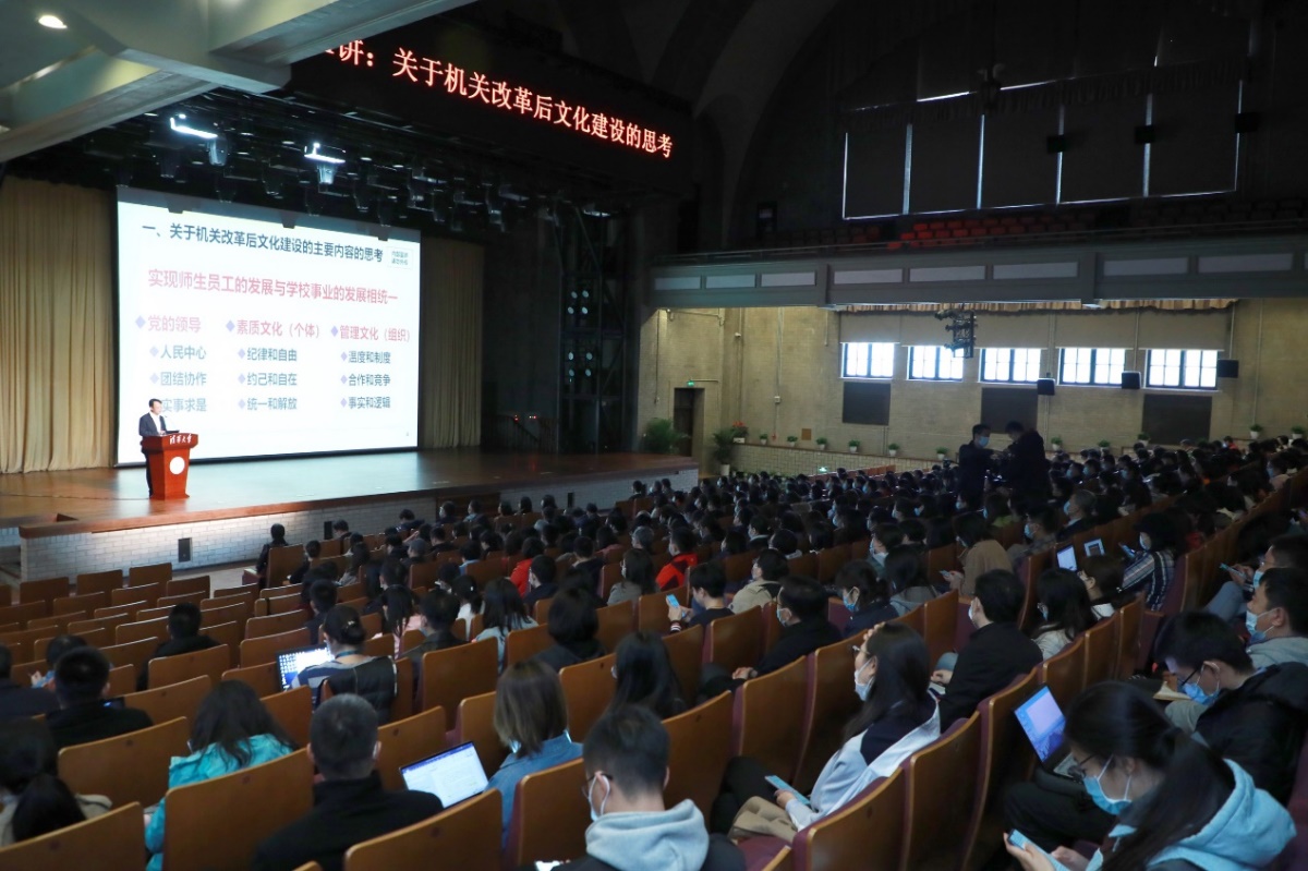 王希勤围绕机关改革后文化建设主要内容、中国特色现代大学办学模式、个人发展、组织发展、个人发展与组织发展相统一等内容进行深入解读。王希勤表示,中国特色现代大学的根本是要坚持党的领导,坚持以人民中心的价值取向,在大学建设中要发挥团结协作的组织优势,坚持实事求是的思想方法,实现师生员工的发展与学校事业的发展相统一。他指出,目前教育也同样面临百年未有之大变局,新葡萄要努力建设中国特色现代化大学,探索中国特色现代大学的治理体系和办学模式,践行中西融汇、古今贯通、文理渗透的办学风格,促进现代文明和传统文化融合。