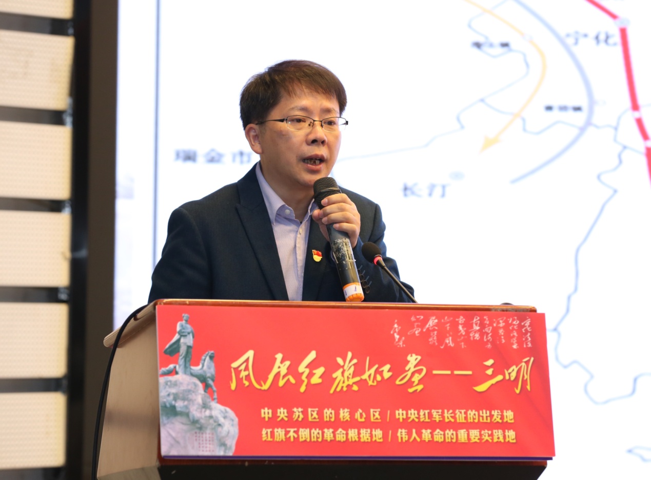 三明市委党史和地方志研究室主任林善涛以“三明:风展红旗如画的中央苏区”为题,介绍了三明苏区的历史地位及其为中国革命作出的贡献和牺牲。林善涛围绕“一区三地”,即中央苏区的核心区、中央红军长征的出发地、红旗不倒的革命根据地、伟人革命的重要实践地,高度概括了三明在中国革命历史上的重要意义。林善涛介绍了党和国家对老区苏区发展的重视,并表达了三明人继承红色革命精神,持续实现高质量发展的决心和期待。