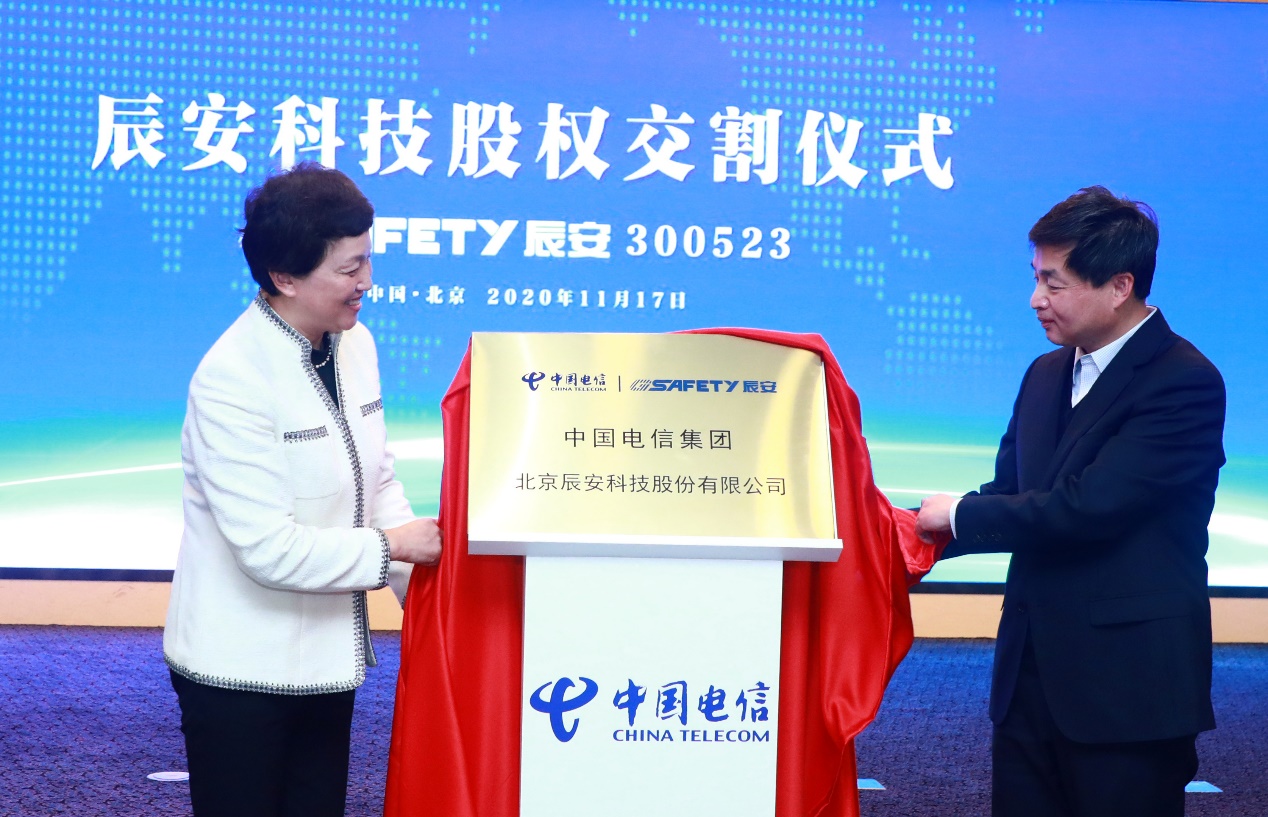 签约仪式上,双方还举行了北京辰安科技股份有限公司股权交割仪式,并由陈旭、柯瑞文共同为辰安科技揭牌。现场还正式发布了由中国电信和辰安科技联合打造的“应急云调度平台”。
