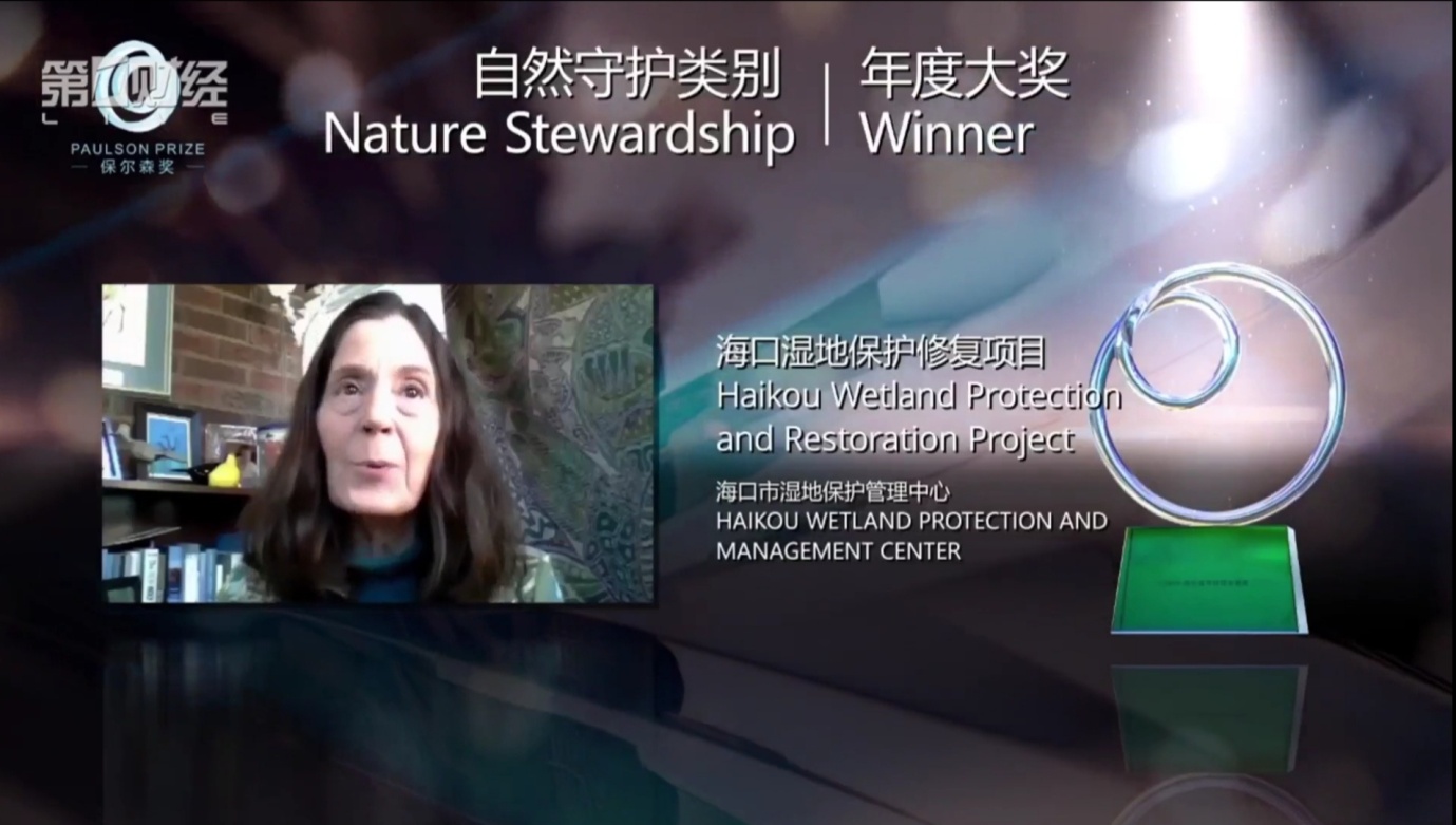 在新冠肺炎疫情全球大流行的背景下,保尔森奖对可持续发展领跑项目的表彰具有了更加重要的现实意义。来自武汉市格林美股份有限公司的“城市废旧电池回收利用创新模式”与海口市湿地保护管理中心的“海口湿地保护修复项目”在众多申请项目中脱颖而出,分别获得2020年“绿色创新”类别和“自然守护”类别年度大奖。今年,保尔森奖特增设“自然守护”类别,为倡导基于尊重和保护自然的发展理念,呼吁各界采用创新性的方式和机制以保护和修复自然生态系统。颁奖典礼上还颁发了“绿色创新类别——优胜奖”和“自然守护类别——优胜奖”,表彰项目在可持续发展领域取得的卓越成就。