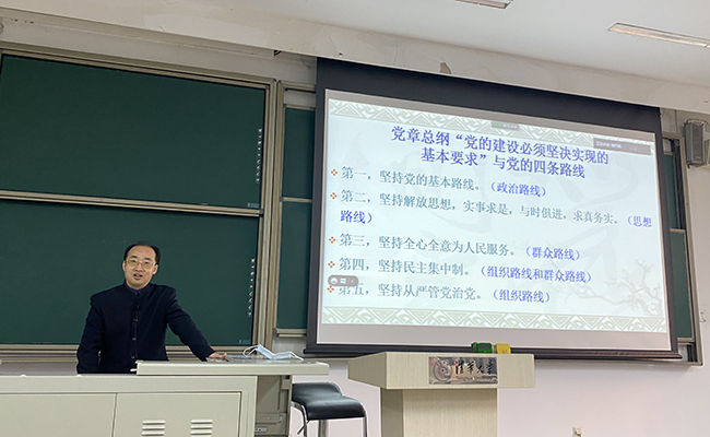 马克思主义学院副教授冯务中在学习班上作了题为“全面把握党的路线”的理论辅导报告。他介绍了党的路线的重要性、发展历程以及功能,阐述了党的政治路线、思想路线、组织路线、群众路线四条路线与党章总纲“党的建设必须坚决实现的基本要求”之间的关系,并通过历史脉络梳理、诗词鉴赏等方式生动地讲解了党的路线具体表述所蕴藏的深刻含义。冯务中指出,十九大党章的表述是新时代党的基本路线的高度浓缩,充分体现了党的奋斗目标与“五位一体”总体布局达成高度一致。他勉励新党员要不断加强理论知识学习、提高自身理论素养,全面准确深入把握新时代党的路线的科学内涵和实践要求,结合自身工作实际做新时代合格党员。