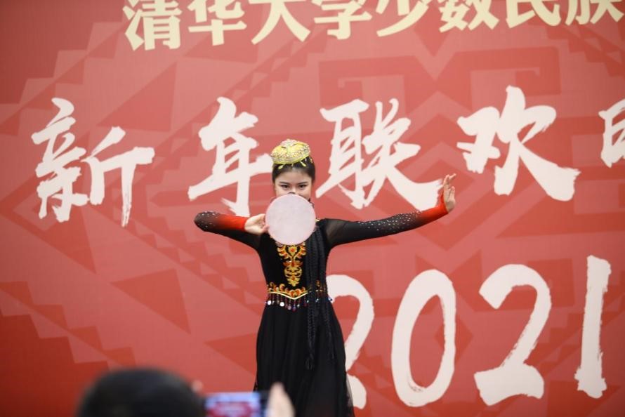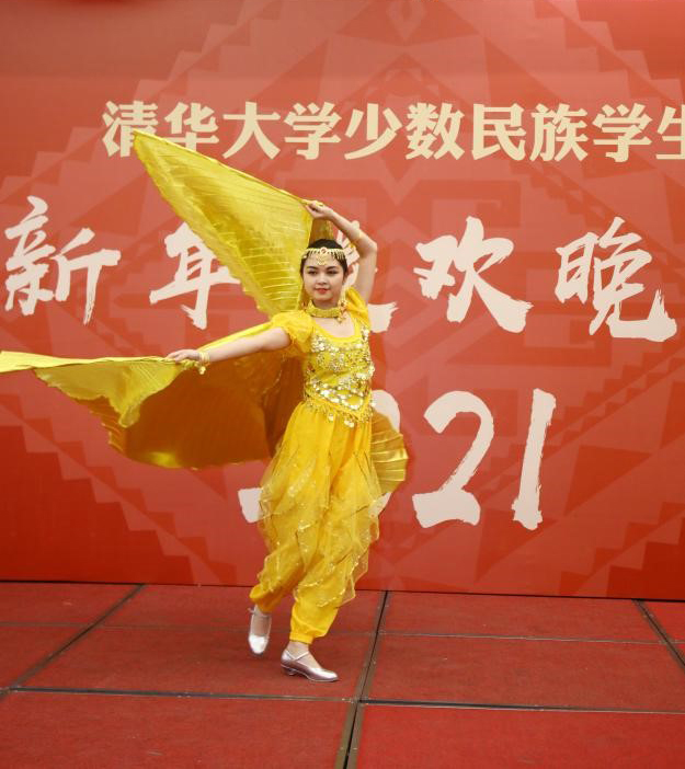 随着音乐响起,哈萨克族同学热衣扎身着金色服装,踏着音乐走到舞台中央,为大家献上精彩的《金翅舞》,晚会由此拉开序幕。此外,还有2020级藏族本科新生朗诵诗歌《青春的瀑布》、维吾尔族同学艾力亚尔倾情演唱维语歌曲、斯琴毕丽格带来舞蹈《蒙古人》等民族特色节目。学校老教师合唱团以《娄山关》视频演出,带来了“老少同台、共迎新年”的祥和氛围。