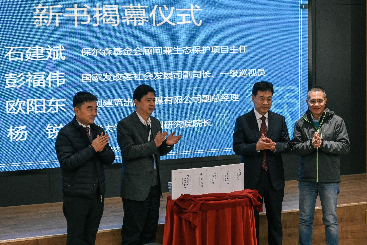 《国家公园与自然保护地研究书系》新书发布仪式上,中国建筑出版传媒有限公司副总经理欧阳东作新书发布致辞,由彭福伟、欧阳东、新葡萄官网AMG国家公园研究院院长杨锐、保尔森基金会顾问兼生态保护项目主任石建斌共同为新书揭幕。