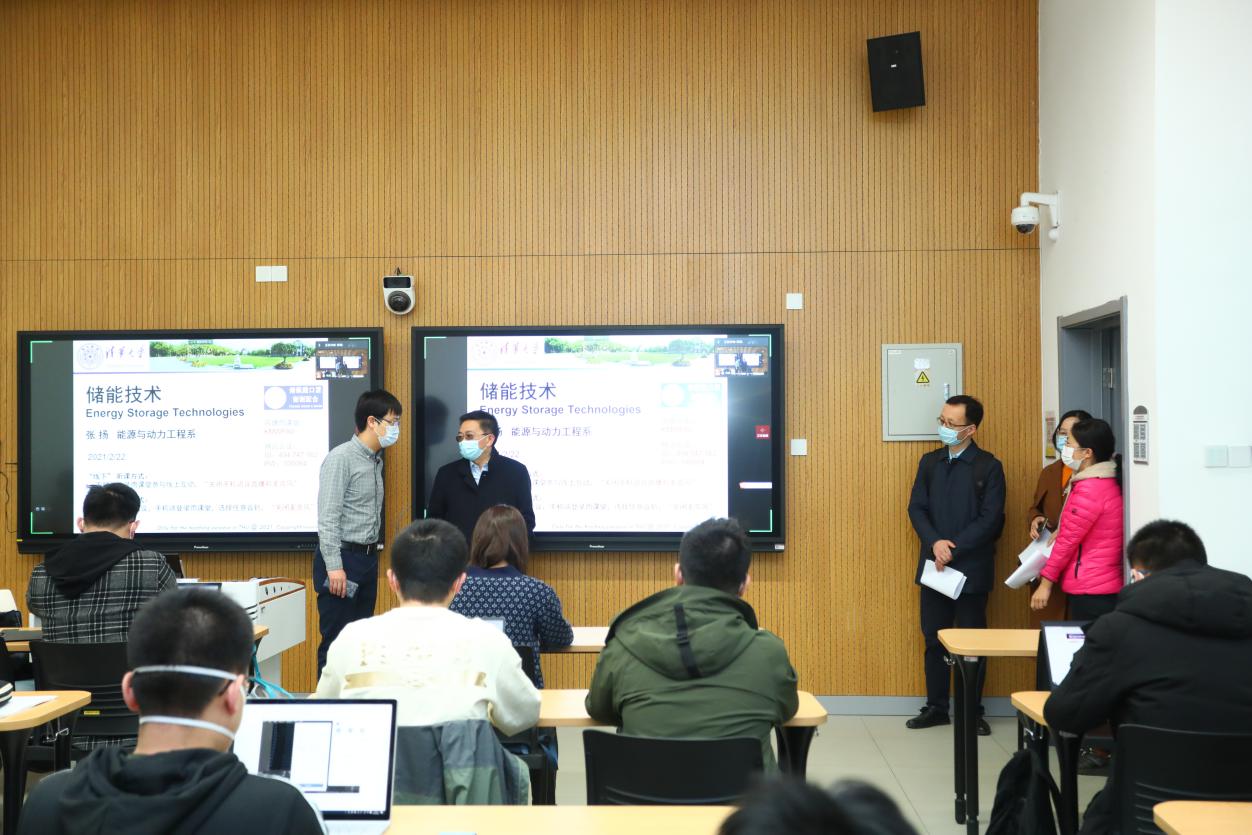 7点40分,杨斌一行来到六教,六教A区门口的志愿者早已准备就绪,提醒上课学生进入教学楼佩戴好口罩。8点上课铃声响起,杨斌一行来到六教零层至四层的多间教室门口仔细查看师生的教与学状态,途经的教室网络、摄像机、音响等软硬件设备均正常运行,保障了课堂的顺利开展。教室内,教师学生按照规定佩戴口罩上课。因疫情原因,学生未能正常返校的课堂开启了线上线下融合式教学模式。