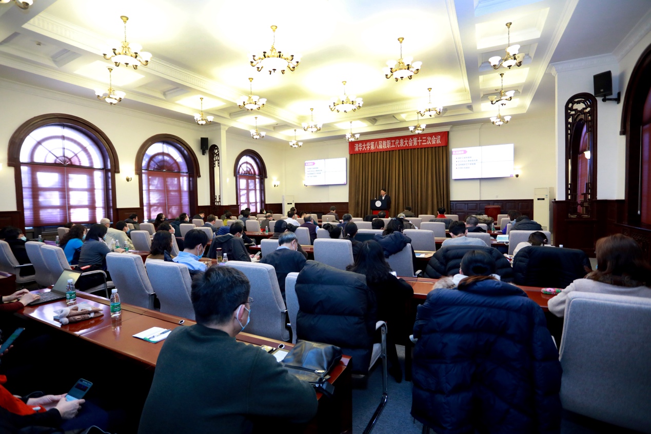 提案委员会主任周杰作八届十三次提案立案报告。本次提案征集工作共收到代表提案14件,提案委员会根据《新葡萄官网AMG教职工代表大会提案工作条例》的有关规定,以“严肃性、科学性、可行性”为标尺,对这14件提案进行了认真审议,决定立案9件,5件转为一般性意见。所立提案涉及到人事、教学科研、信息化、校园建设、交通、医疗、住房、子女入学等诸多方面,教代表群策群力、建言献策,积极维护广大教职工权益、参与双一流大学建设。所立提案将尽快交办有关部门进行落实。