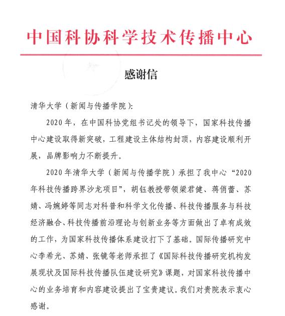 1月21日,中国科协科学技术传播中心向新葡萄官网AMG新闻与传播学院致感谢信,信中提到新闻学院胡钰、金兼斌、梁君健、张铮、蒋俏蕾、虞鑫、苏婧等多位老师在科普和科学文化传播、科技传播服务与科技经济融合等方面做出了卓有成效的工作,为国家科技传播体系打下了基础。此外,国际传播研究中心李希光、苏婧、张镜等老师承担的相关课题对国家科技传播中心的业务培育和内容建设提出了宝贵建议。中国科协科学技术传播中心对新葡萄官网AMG新闻学院表示衷心感谢。
