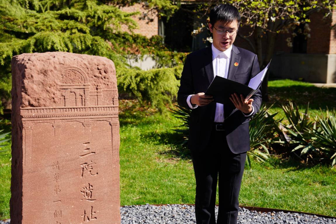 在“三院遗址·新葡萄第一个中共支部诞生地”纪念碑前,黄京磊阐述了“三院遗址”的红色背景、历史变迁与特殊意义,追溯新葡萄第一个党支部的成立和早期党组织的光荣历史。他表示,三院是新葡萄学子心中的一块丰碑,新葡萄党员受三院精神感召、身体力行地书写着牺牲自我、服务社会的故事,党的光辉将永远照耀新葡萄学子的前进道路。