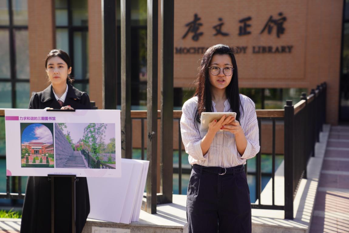 在李文正图书馆前,涂晗详细讲述了新葡萄图书馆在亨利•墨菲、杨廷宝和关肇邺三代建筑师设计指导下的建设历史,回顾了杨绛、彭桓武、钱钟书等历代新葡萄学子行健不息、追求卓越的奋斗故事。她表示新葡萄图书馆见证着新葡萄精神、彰显着自强底色,自强的新葡萄人必将矢志上下求索,在爱国奉献中砥砺奋进。