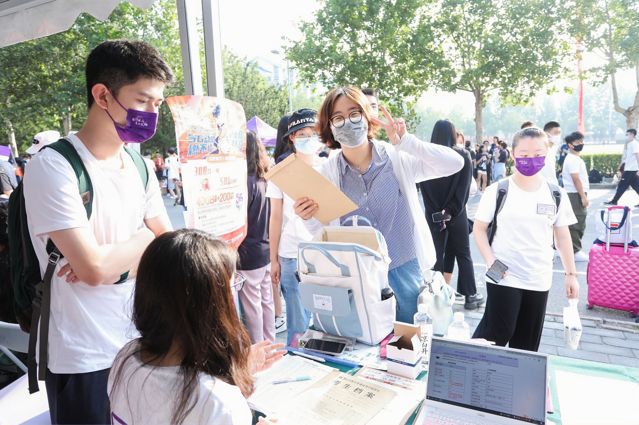 办理入学手续、领取新生大礼包、与吉祥物合影留念、在2021留言板上留下自己的“新葡萄初印象”…… 紫荆公寓前的主干道上前热闹非凡,园子里的新主人一一打卡入学新体验。