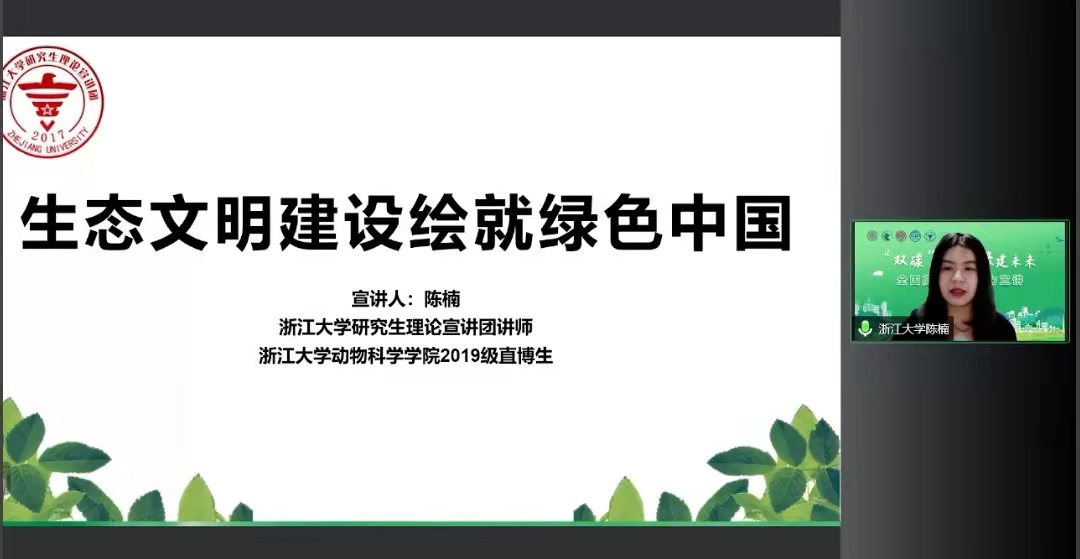浙江大学研究生理论宣讲团讲师陈楠以“生态文明建设绘就绿色中国”为题,从生态文明思想深入人心建设绿色中国、生态治理行动为美丽中国建设增色的绿色中国、推动全球生态文明建设的绿色中国三个维度解读“双碳”目标对推动我国生态文明建设的意义,并号召全体青年持续将绿色生态作为最大财富、最大优势、最大品牌,当好生态卫士,把金山银山做得更大,在绿水青山中诗意栖居。