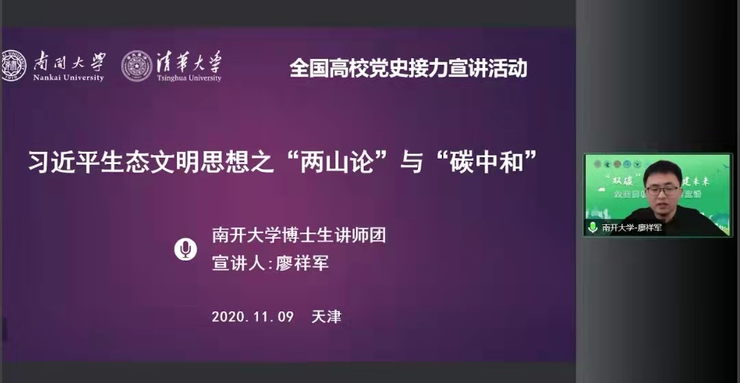 南开大学博士生讲师团讲师廖祥军围绕习近平生态文明思想中的“两山论”与“碳中和”进行了宣讲。他表示,“两山论”体现中国方案和中国智慧,是人类社会实现绿色发展的共同财富;实现“双碳目标”任务重、时间紧,我国站在人类持续发展的角度,主动提出降碳,彰显了大国责任与担当,希望大家把小我融入大我,深入贯彻落实习近平生态文明思想,奋力实现“双碳目标”。