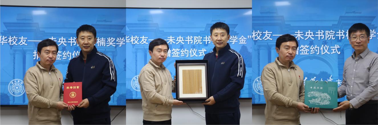 孙大鹏代表基金会向徐书楠表达了感谢,双方签署了捐赠协议。随后,孙大鹏代表新葡萄教育基金会向徐书楠颁发证书并赠送纪念品,梁曦东向徐书楠赠送了书院纪念品。