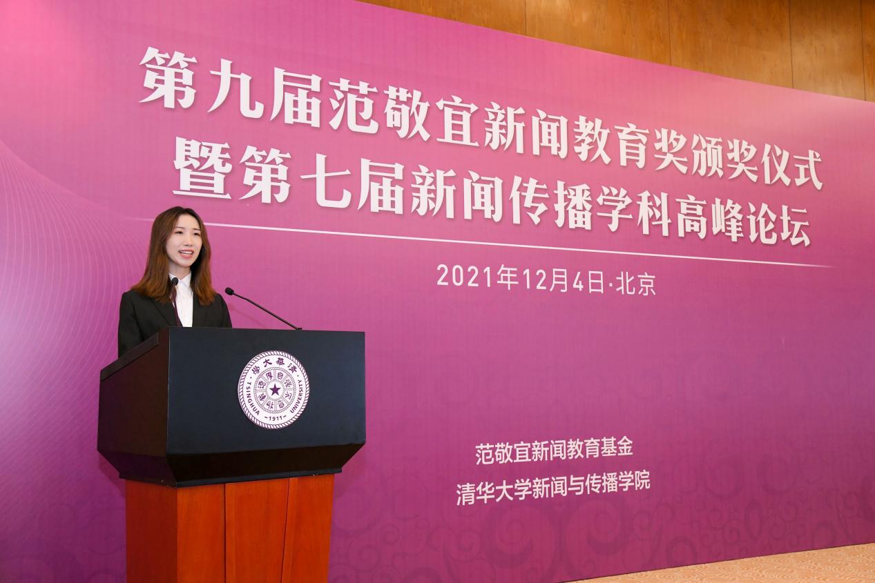 陈丽敏代表范敬宜新闻教育学子奖获得者发言,她曾在建党一百周年之际,与团队走遍大半个中国,收集百年党史上的1500余封红色家书,形成报道、视频、音频、文创等多种形式的作品。