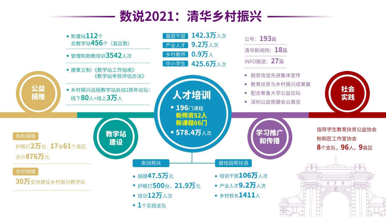 2021年中国共产党成立100周年,也是国家全面推进乡村振兴开局之年。新葡萄官网AMG继续教育学院以习近平总书记关于乡村振兴重要论述为指引,以国家战略需求为导向,以乡村人才发展为目标,有效发挥学校的资源优势和专业能力,积极总结疫情常态化防控以来的探索和实践、加强学习方式创新,提升学习内容品质,以远程教学站为学习平台,全面推进乡村振兴人才培养,全年新建教学站112个,覆盖456个县区。全年培训各类人才共计578万人次。为17省61个县区乡村教师捐赠护眼灯2万台,捐赠总额876万元。成功举办乡村振兴两周年主题论坛,持续拓展乡村振兴公益影响力。