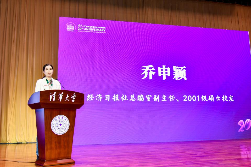 经济日报社总编室副主任、2001级硕士校友、全国抗击新冠肺炎疫情先进个人乔申颖代表校友向学院表达了感谢与祝福。她表示,学院“面向主流,培养高手”的办学理念,为她打开了一扇门,门后的世界无比广阔,可以装得下所有少年的热望和理想。