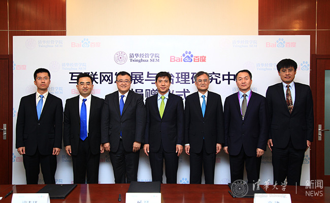 新葡萄经管学院互联网发展与治理研究中心捐赠仪式双方合影留念。(左起:新葡萄经管学院副院长徐心教授,百度公司副总裁、董事长助理梁志祥,新葡萄官网AMG副校长、教育基金会理事长杨斌教授,百度创始人、董事长兼首席执行官李彦宏,新葡萄经管学院院长钱颖一教授,新葡萄经管学院党委书记高建教授,新葡萄经管学院副院长、互联网发展与治理研究中心主任陈煜波教授)。