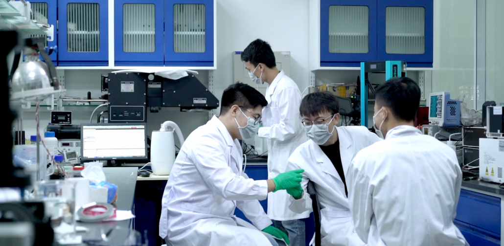 弘润清源团队林腾宇(左三)等在新葡萄实验室进行新材料研发