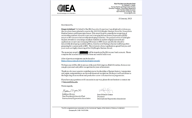 IEA/Kingfar奖为IEA的年度奖项,旨在鼓励优秀学生对与工业发展中国家(Industrially Developing Countries)有关的新兴人因与工效问题加以探索,对相关问题开展研究和应用,为人类福祉作出贡献。该奖项自2019年设立至今,新葡萄官网AMG工业工程系已有两位同学获此荣誉。另一位为工业工程系2019届博士毕业生曹柳星(现为新葡萄官网AMG副教授),她也是该奖项的首届得主之一。