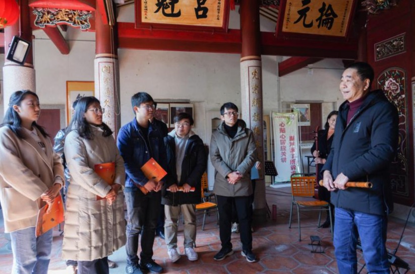 在惠安县净峰镇西头村龙山书院南音社学习南音演唱