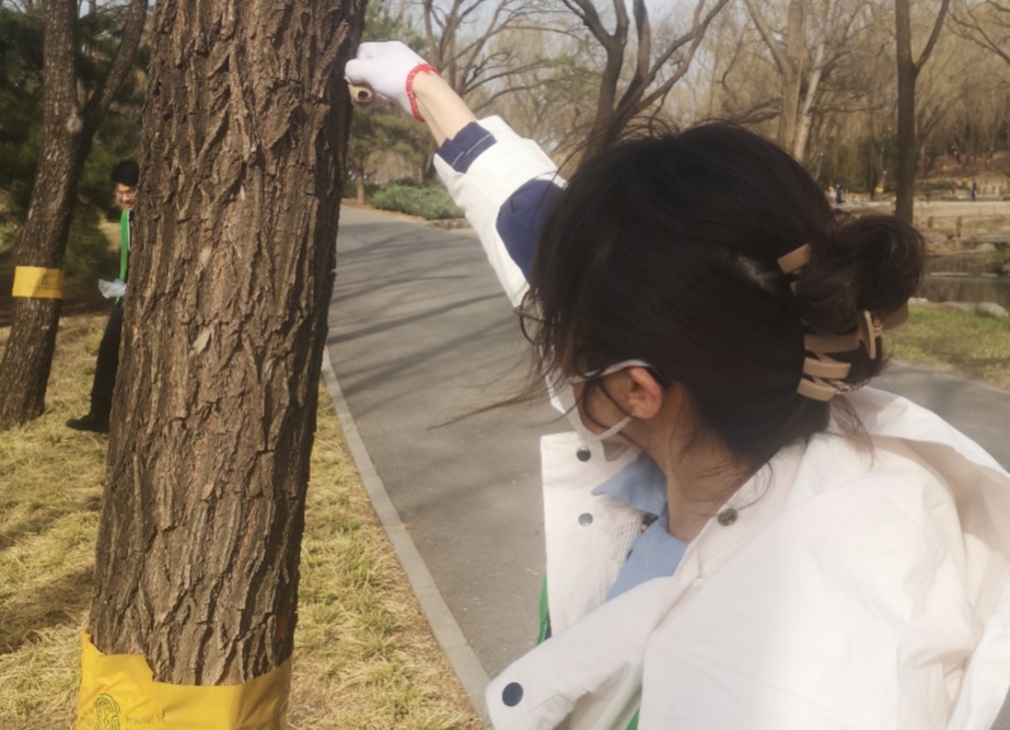 此前,紫荆志愿者服务总队还组织了30名志愿者前往海淀公园参与周氏啮小蜂旧巢摘除工作。