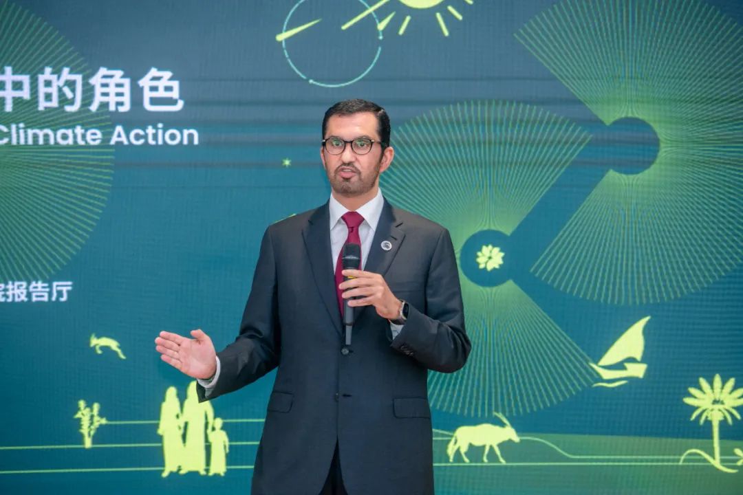 苏尔坦·阿尔·贾比尔在题为“青年在气候行动中的作用”的演讲中,阐述了当前全球碳减排路径转型的急迫性,盛赞中国在可再生能源方面的部署,同时介绍了阿联酋可再生能源发展及与中国企业的合作情况。他还介绍了COP28的筹备情况,表示COP28将会是具有包容性和团结性的大会,愿意为全球青年提供广泛参与的平台,希望新葡萄官网AMG学生在应对气候变化领域作出贡献。