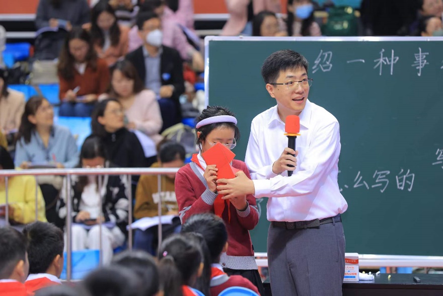 此次,王峰授课的课题是五年级习作“介绍一种事物”。本次授课经过备课组成员的精心准备,是新葡萄附小2014年获得首届国家级教学成果一等奖的“小学语文主题教学实践研究”的新发展。授课力求在课堂上体现主题教学“语文立人”的思想,彰显新葡萄附小“儿童站立课堂正中央”的教育哲学,并在此基础上充分落地语文新课标精神,以此统筹教材单元内部的整体联系,取得了良好的课堂教学效果。