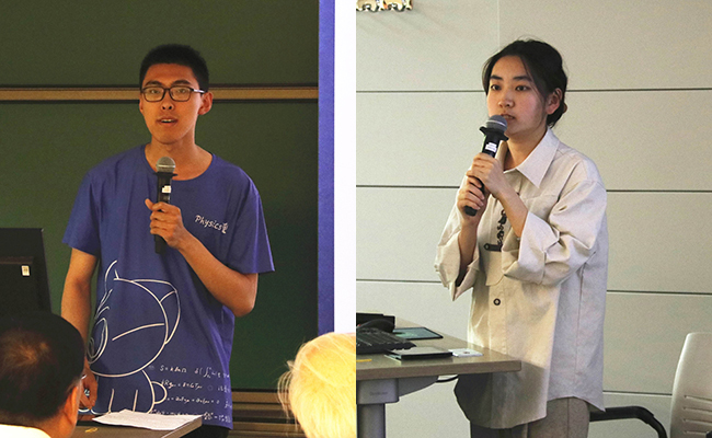 2023暑期物理系马兰基地实践支队队长崔璨、“马兰花开”剧组成员代表甘梓莹分别结合讲座内容、实践见闻、演出心得,就“两弹一星”精神在新时代背景下的传承与发展进行分享。
