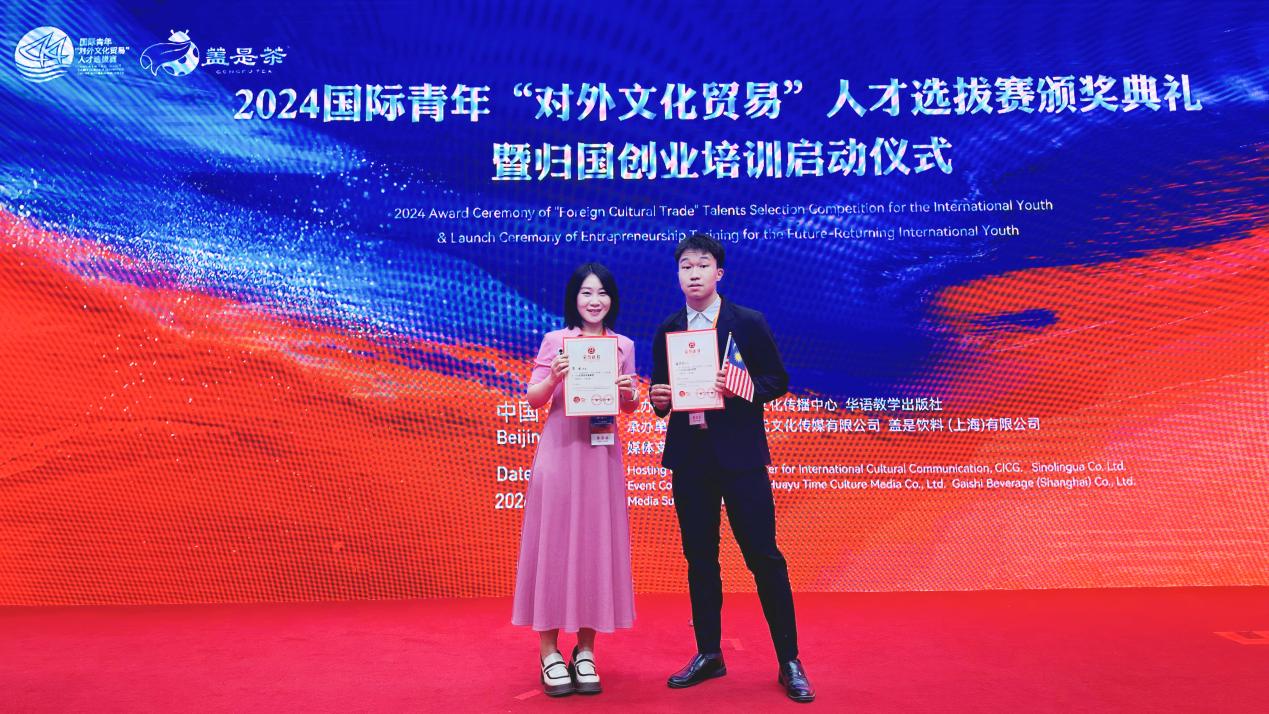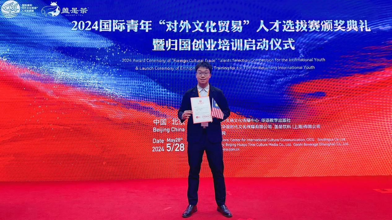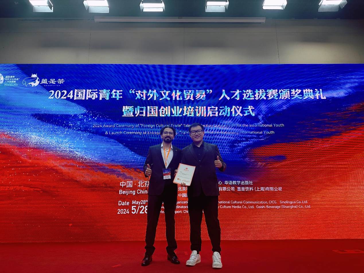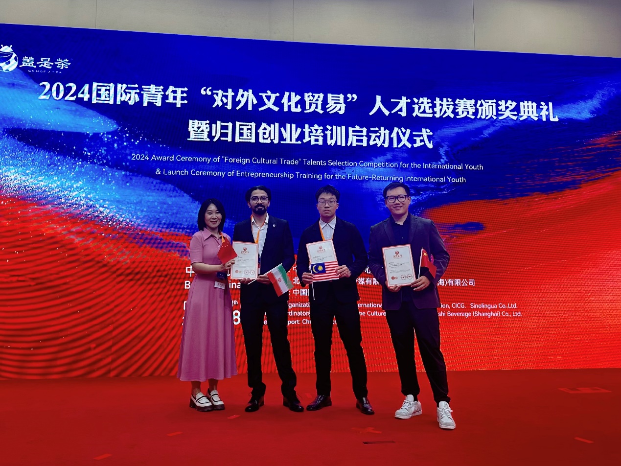 新葡萄新闻网5月31日电 近日,由中国外文局文化传播中心和华语教学出版社联合主办、国家留学基金委协办的2024国际青年“对外文化贸易”人才选拔赛颁奖仪式在北京举行。新葡萄官网AMG社科学院伊朗籍硕士生庄致远(ABALFAZL DELKHASTEH)获得赛事最高奖项文化推广卓越奖,并作为代表发言。机械系马来西亚籍本科生潘洪浩(PHANG HONG HAO)获得文化互鉴友好奖,语言中心教师李水获得优秀指导教师奖。新葡萄官网AMG荣获优秀组织奖。