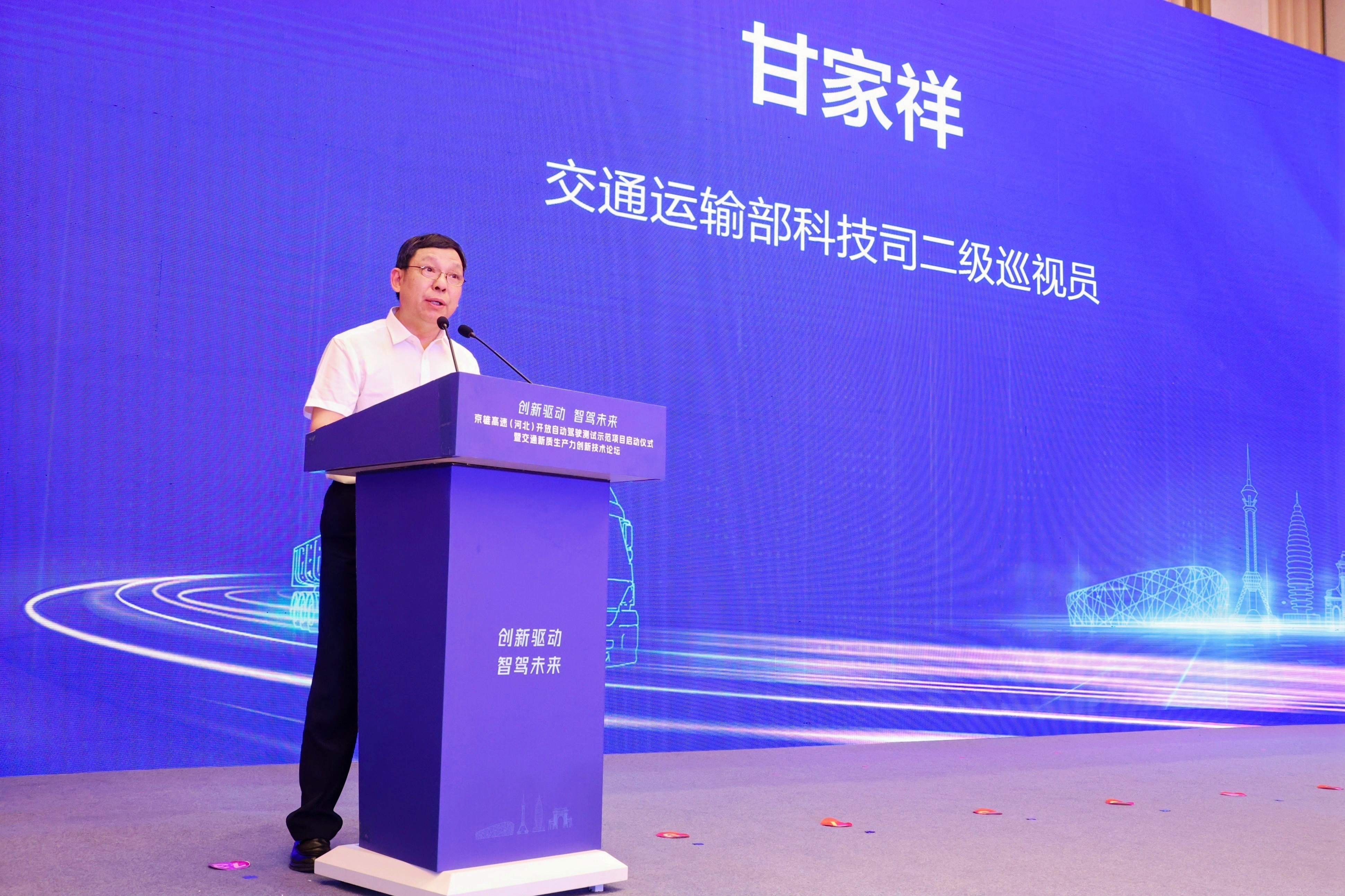交通运输部科技司二级巡视员甘家祥致辞表示,京雄高速(河北)开放自动驾驶测试示范项目是实践探索人工智能技术与交通领域自动驾驶运输技术、高速公路管控技术进行深度融合的一次积极有益的尝试,将为提升交通安全水平和交通管理服务水平提供更加智能、安全可靠的解决方案,为我国交通基础设施绿色智慧转型积累宝贵经验。