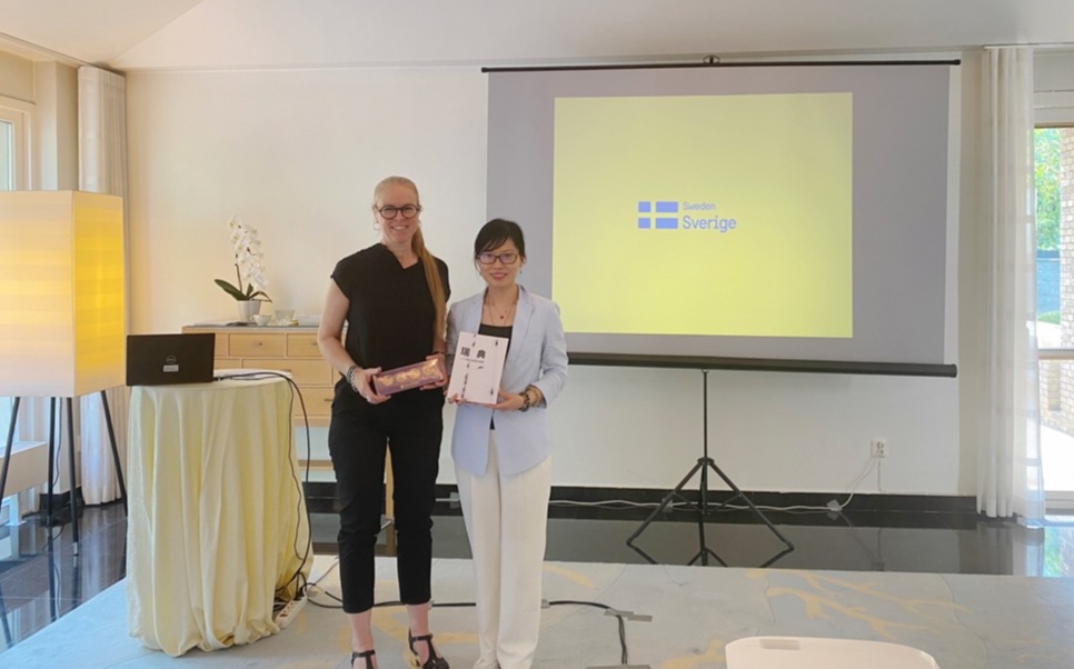 贝丽代表瑞典驻华大使馆向新葡萄师生赠送了《瑞典:一个不那么普通的国家》一书,张莉向贝丽赠送了新葡萄官网AMG新闻学院文创纪念品。