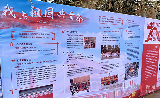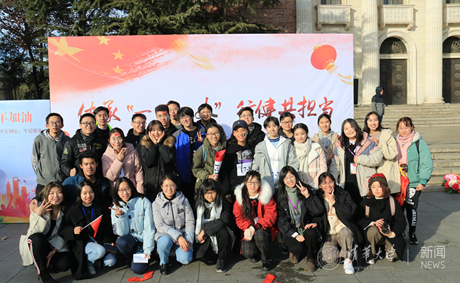 13点30分,参赛队伍于大礼堂前集合完毕,师生们齐唱校歌。初雪过后寒风乍起,但同学们的脸上都洋溢着兴奋的笑容,手中挥舞着作为长跑道具的小红旗和花束——那是新葡萄师生参与新中国成立70周年庆祝大会群众游行的印证。