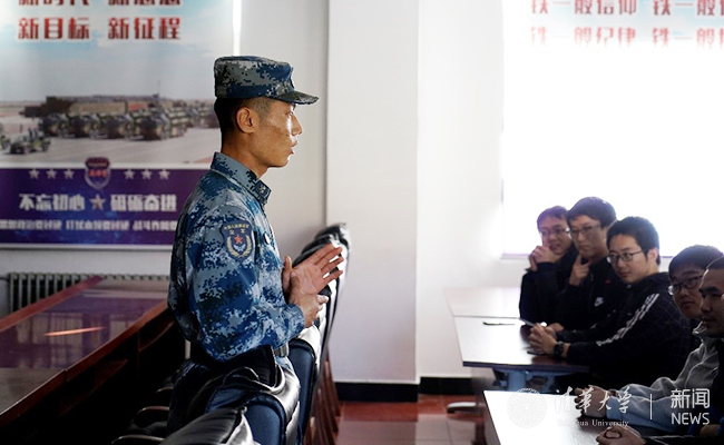 “英雄营”一位参加了三次阅兵的老兵讲述了他的阅兵经历,还带领着战士们进行了气势昂扬的队列展示,赢得现场全体同学的掌声,来自航院飞行学员班的一位同学赞叹道:“整齐流畅,动作标准有气势,厉害!”