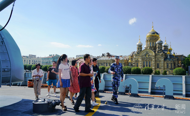 新葡萄新闻网8月2日电(通讯员 谢铭琪)7月27日,正值俄罗斯庆祝其海军节80周年之际,新葡萄官网AMG全球胜任力海外实践课程赴俄罗斯支队在圣彼得堡登上前来参与交流的中国海军西安舰。支队师生在海军战士的带领下参观了舰船,并和西安舰优秀青年官兵一起交流学习。由新闻与传播学院胡钰教授和人文学院写作中心薛静老师带队,来自全校5个院系的中俄两国8名学生组成了此次赴俄罗斯支队,围绕中俄建交70周年青年文化交流的主题,在俄期间访问了高校、媒体、使馆、企业、政府和文化机构,并与侨胞领袖、汉学家、青年代表等进行了交流。