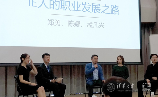 “IE精英汇”上郑勇、陈娜、孟凡兴校友(右三、右二、右一)与同学互动交流