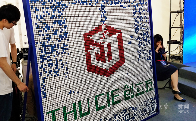 现场观众和工作人员用1089个魔方搭建成的魔方墙