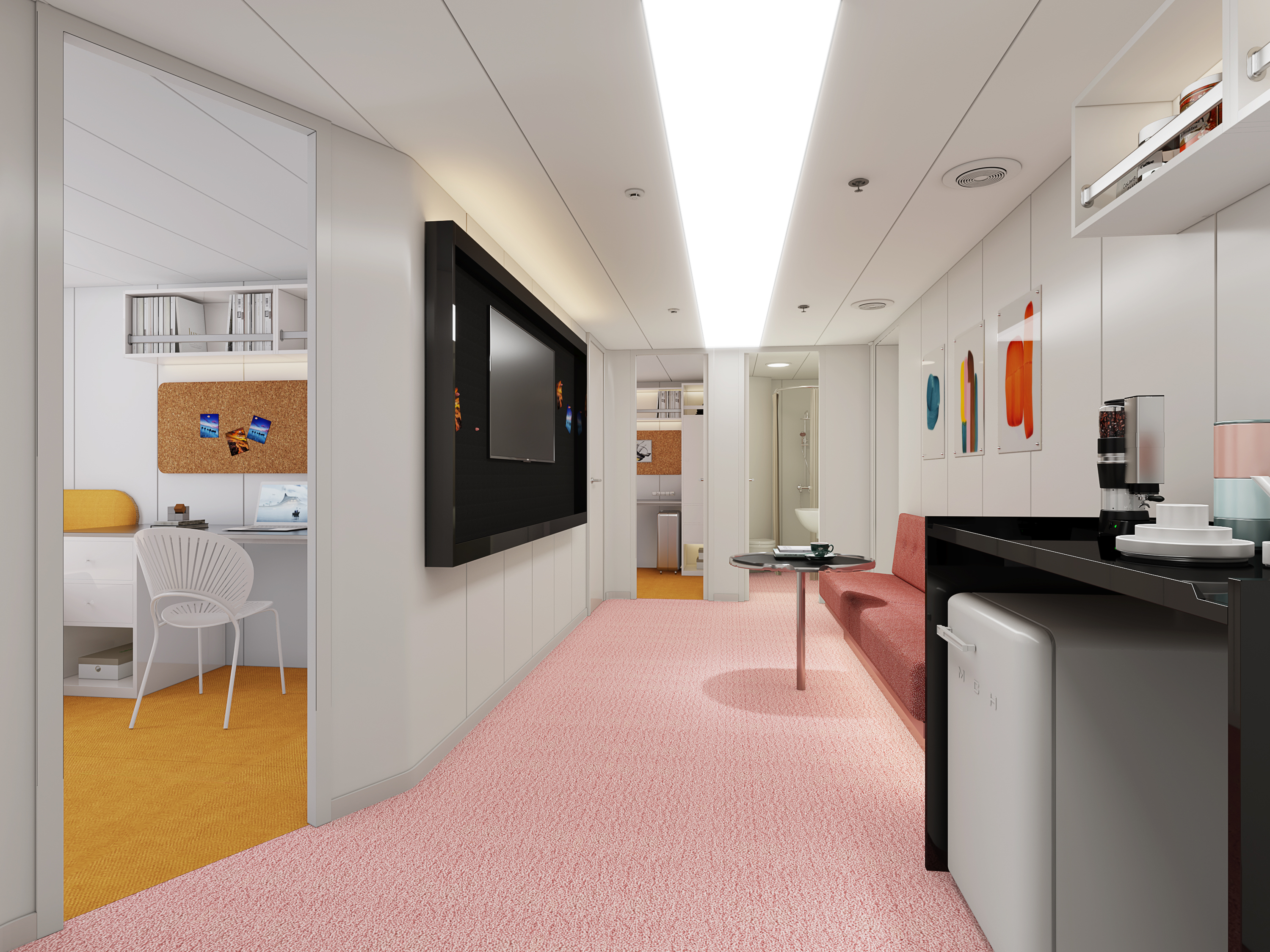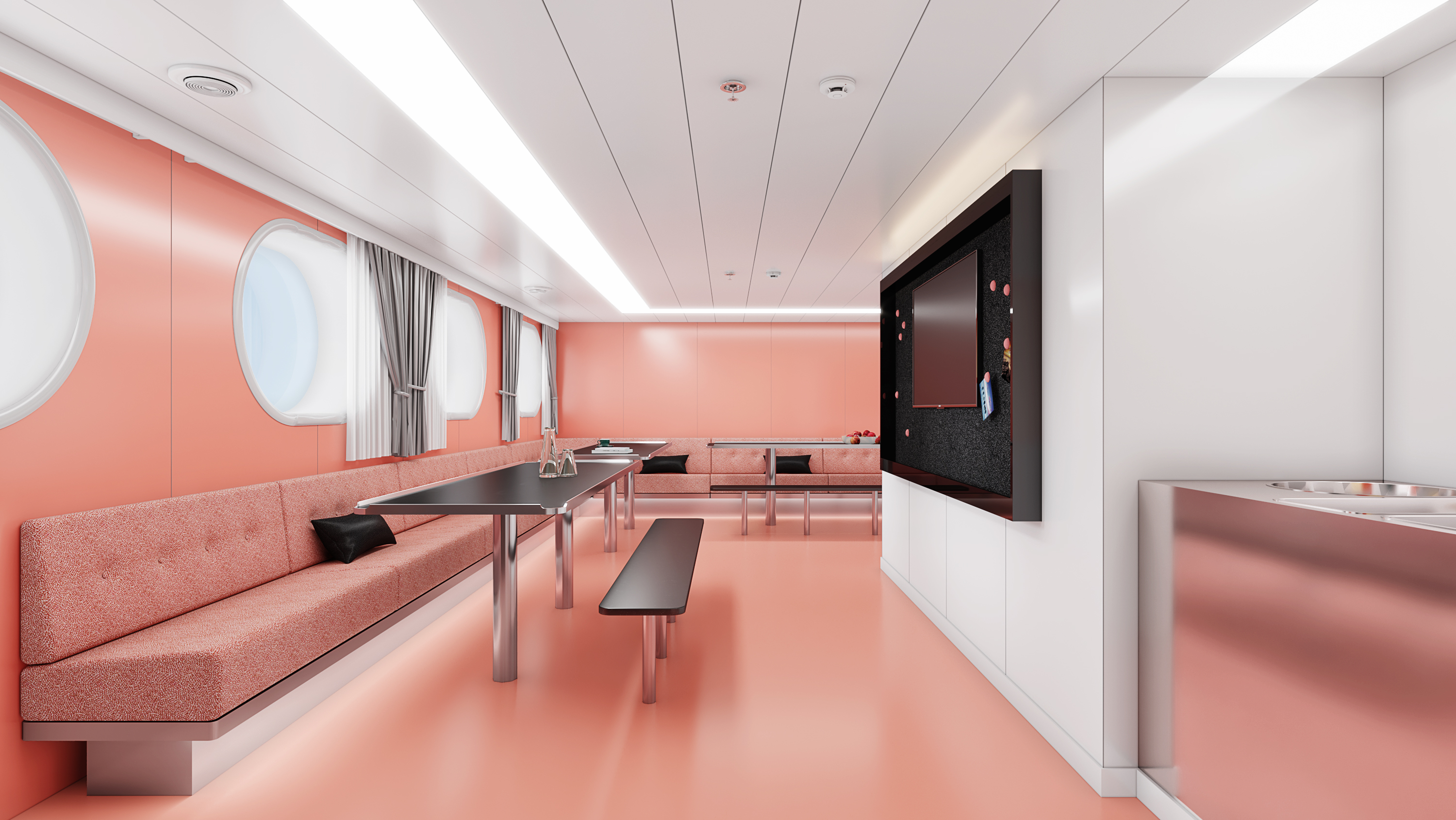 设计具体内容包括整体空间规划与结构可行性分析(此部分内容与中国舰船研究设计中心的工程师合作完成)、外观造型与涂装、色彩计划与材料选择、健康照明系统、寻路与空间识别系统、舱室家具与软装配饰等等。自2020年12月至2021年7月的半年多时间里,唐林涛团队成员夜以继日聚焦于母船的系统设计工作,力求将最初的创意转化为可实现的实体。