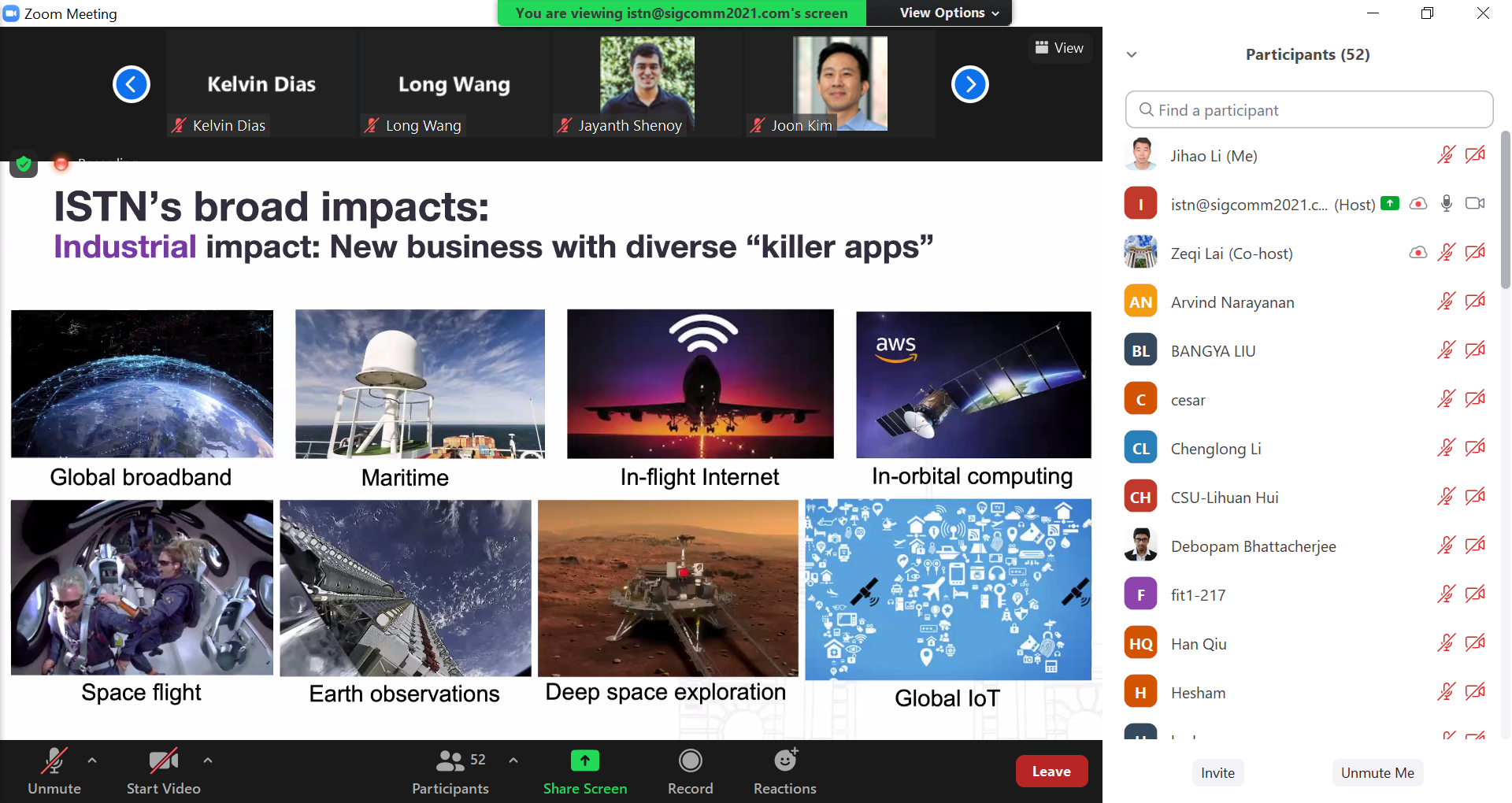 新葡萄新闻网9月3日电 8月23日,新葡萄官网AMG网络研究院网络应用及安全研究室在全球网络通信领域旗舰会议ACM SIGCOMM2021上在线成功举办了天地一体化网络学术讲座(Integrated Space-Terrestrial Network Tutorial)。ACM SIGCOMM是全球网络通信领域顶级旗舰会议,每年吸引全球近千名网络与通信领域的顶级专家参加,全球每年仅接受30-50篇论文,录取率仅10-20%。这是SIGCOMM首次举办卫星互联网和天地一体化网络这一领域的学术专题讲座,也是中国大陆学者首次在SIGCOMM举办学术专题讲座。