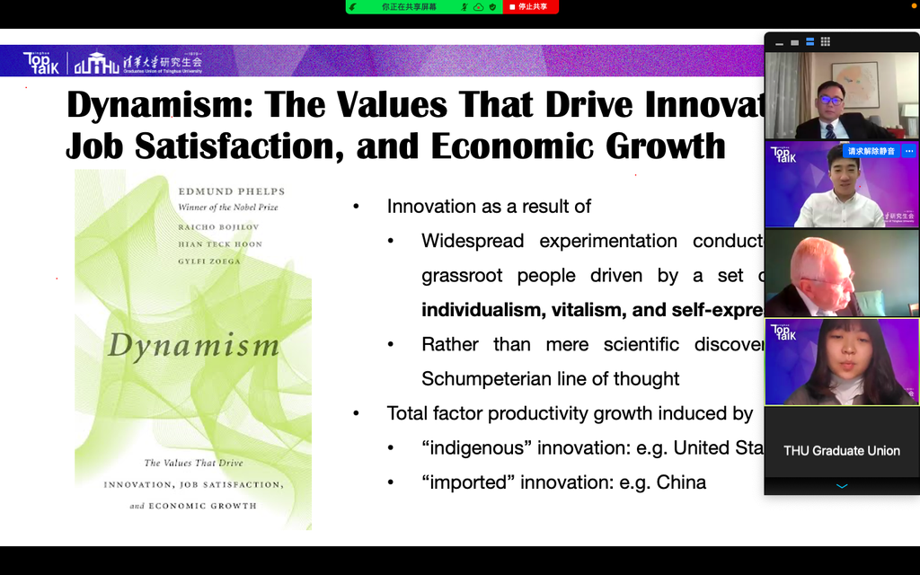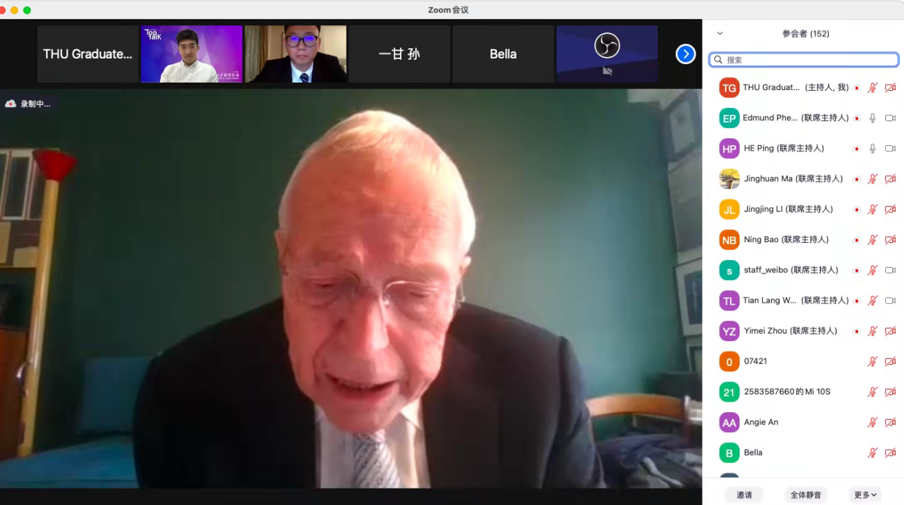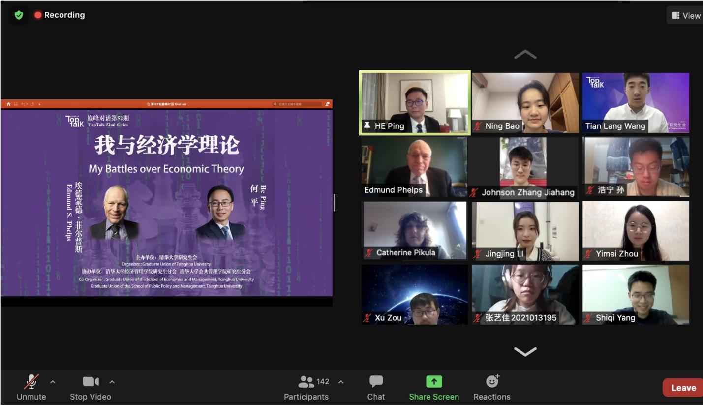 新葡萄新闻网11月23日电 11月17日晚,诺贝尔经济学奖得主埃德蒙德•菲尔普斯(Edmund S. Phelps)做客第52期“巅峰对话”,讲述了他作为理论经济学家的职业生涯。经管学院何平教授担任对话嘉宾。本次活动由校研究生会主办,经管学院研究生分会、公管学院研究生分会协办,180余名师生线上参与本次活动,直播通道观看量达8138次。