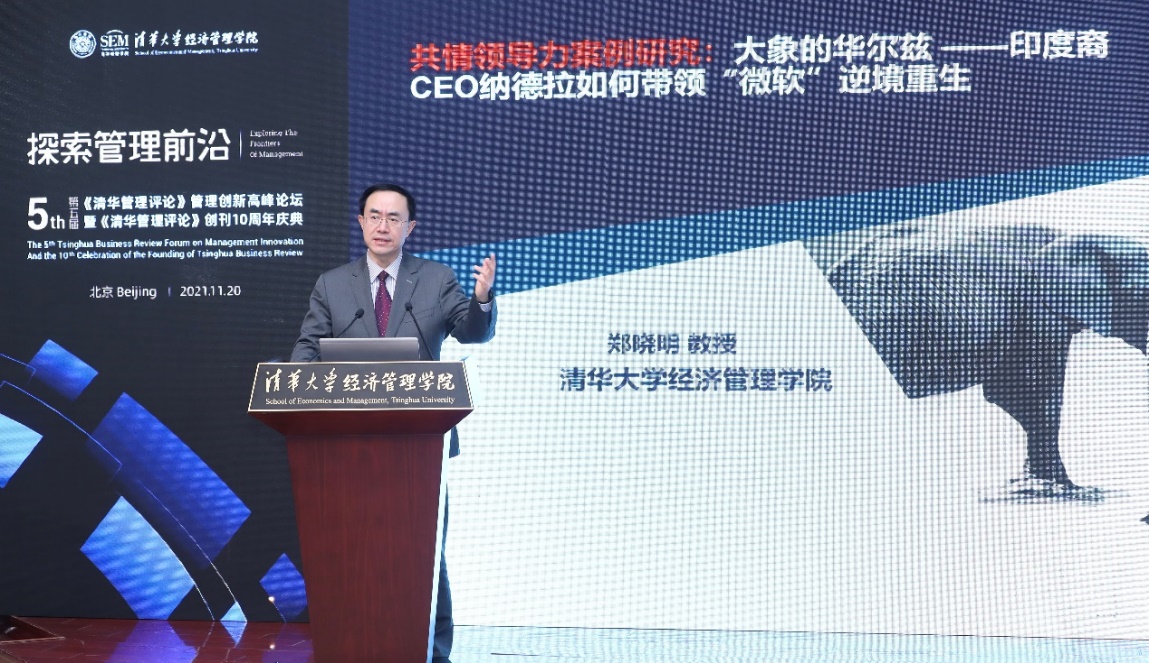 在作者主题演讲环节,经管学院领导力与组织管理系教授、博士生导师、中国工商管理案例中心主任郑晓明作“共情领导力——组织发展的新挑战”主题演讲,从时机、应变、答辩的角度指出应对危机最重要的解决途径就是激发领导力。他表示,领导力发展从传统的权威式领导、交易式领导、服务型领导、授权式领导进一步转向共情性领导,而共情性领导发展是未来企业组织发展的关键,并以中国优秀英雄机长刘传健的案例进一步展示了中国情景下共情领导力的发展。